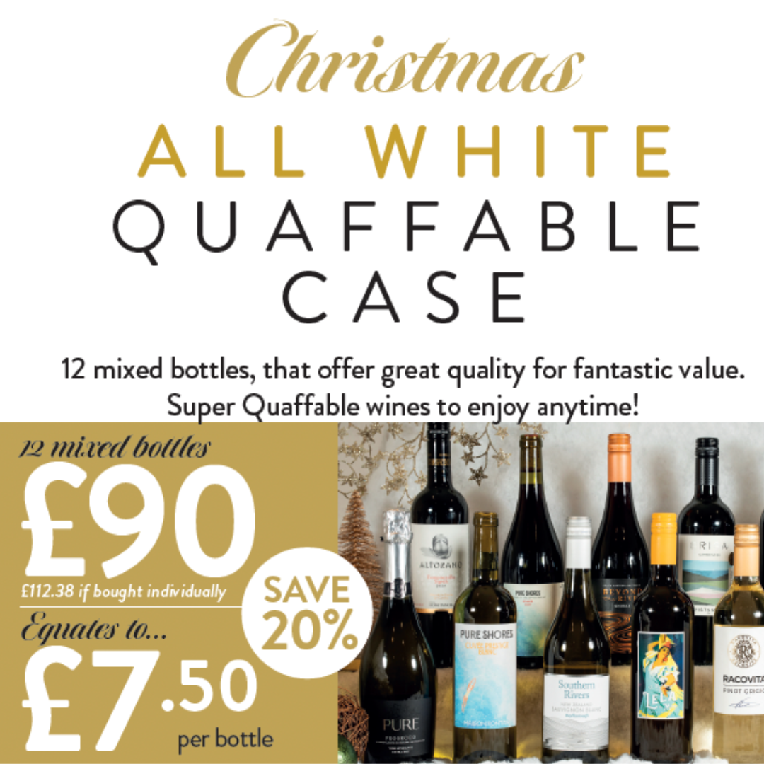 Our Christmas all white ‘Quaffable Case’ is a selection of the best value wines we can track down. Working out at just £7.50 per bottle these are wines that are more interesting and can offer better quality than the wines available in the UK supermarkets. Discover your new favourite ‘Quaffable’ wine.
